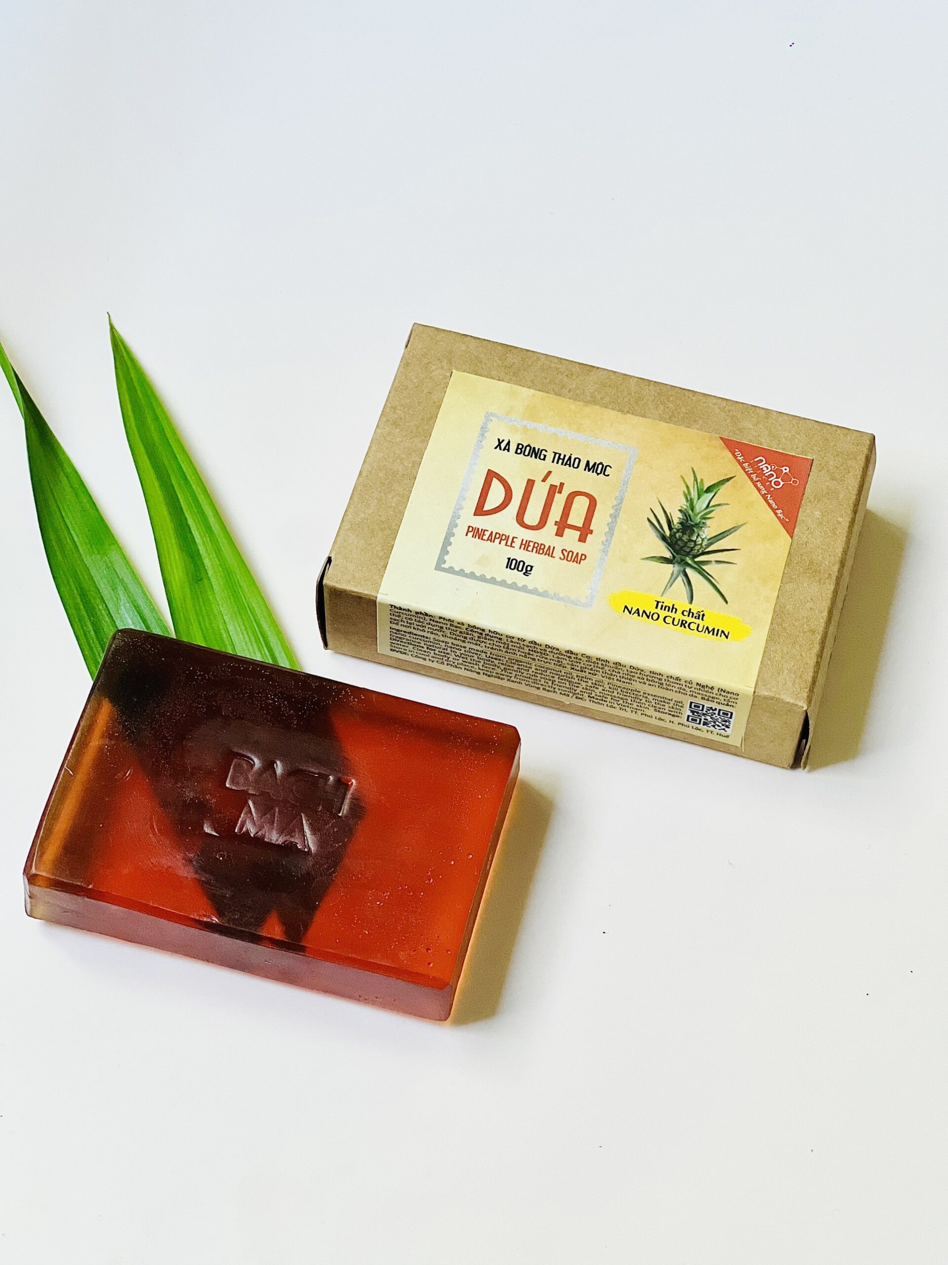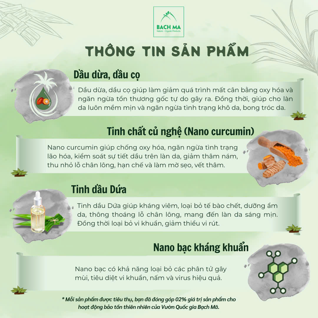 Thành phần: Phôi xà bông hữu cơ từ dầu Dừa, dầu Cọ; tinh dầu Dứa, tinh chất củ Nghệ (Nano Curcumin), Nano Bạc.