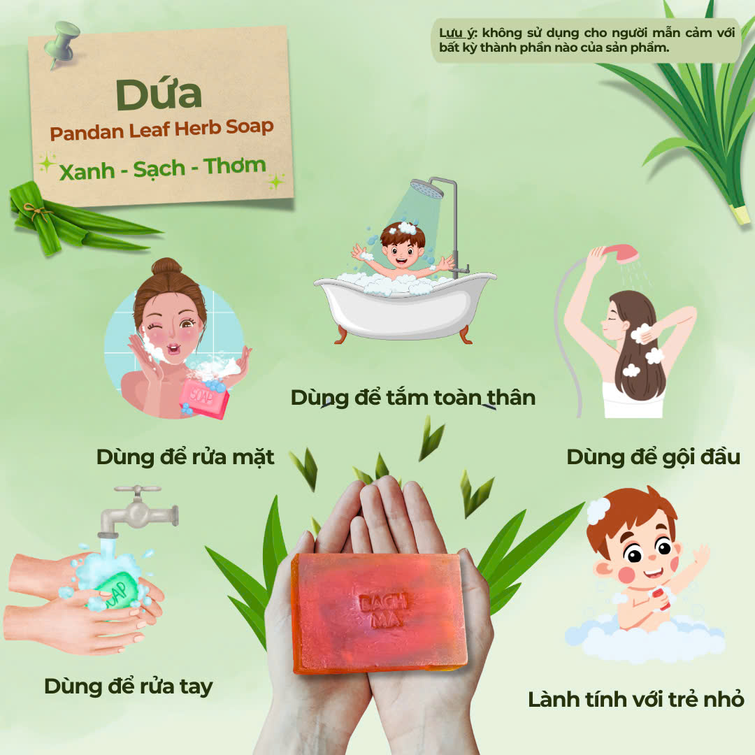 HDSD: Làm ướt cơ thể, chà nhẹ xà bông lên da, massage, tắm sạch lại với nước. Dùng được cho tắm hoặc rửa mặt, sản phẩm thân thiện và an toàn cho da.