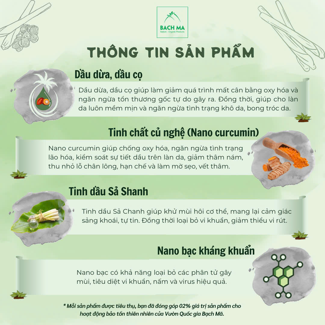 Thành phần: Phôi xà bông hữu cơ từ dầu Dừa, dầu Cọ, tinh dầu Sả Chanh, tinh chất củ Nghệ (Nano Curcumin), Nano Bạc